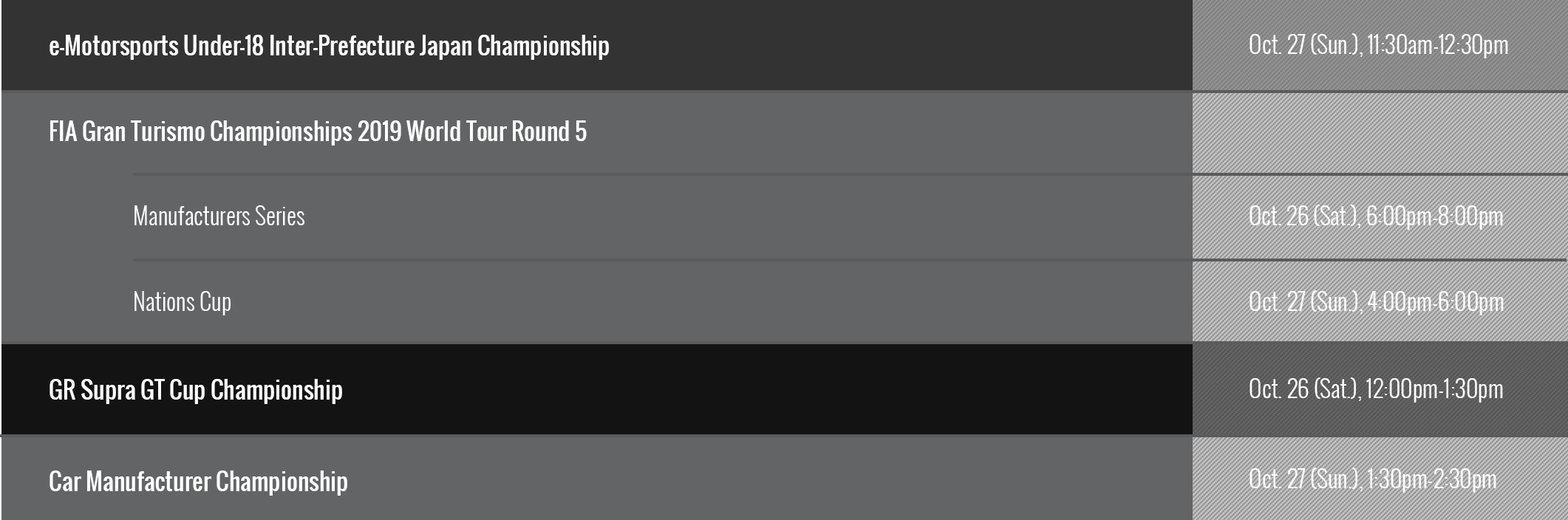 The venue will feature the “FIA Gran Turismo Championships 2019 World Tour Round 5,” a real-world component of the game’s “FIA Gran Turismo Championships 2019,” allowing visitors to view the heated battle between top players from around the world up close. Visitors will be able to experience Gran Turismo SPORT using the same setup used by the professional e-Motorsport drivers. Furthermore, the “Under-18 Inter-Prefecture Japan Championship” for e-Motorsports will showcase the top drivers under 18 from each prefecture in Japan, and the Car Manufacturer Championship and the one-make GR Supra GT Cup will also take place.