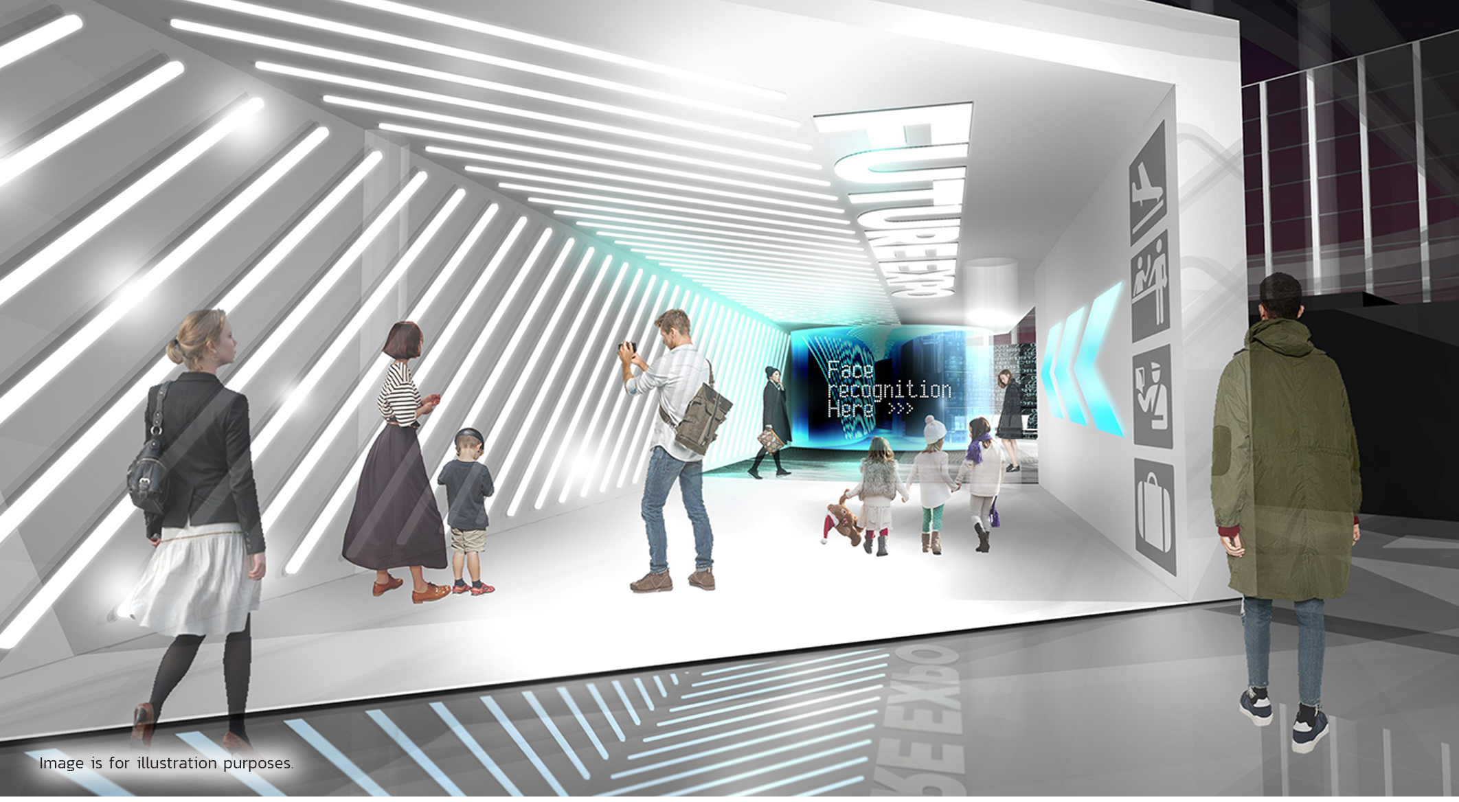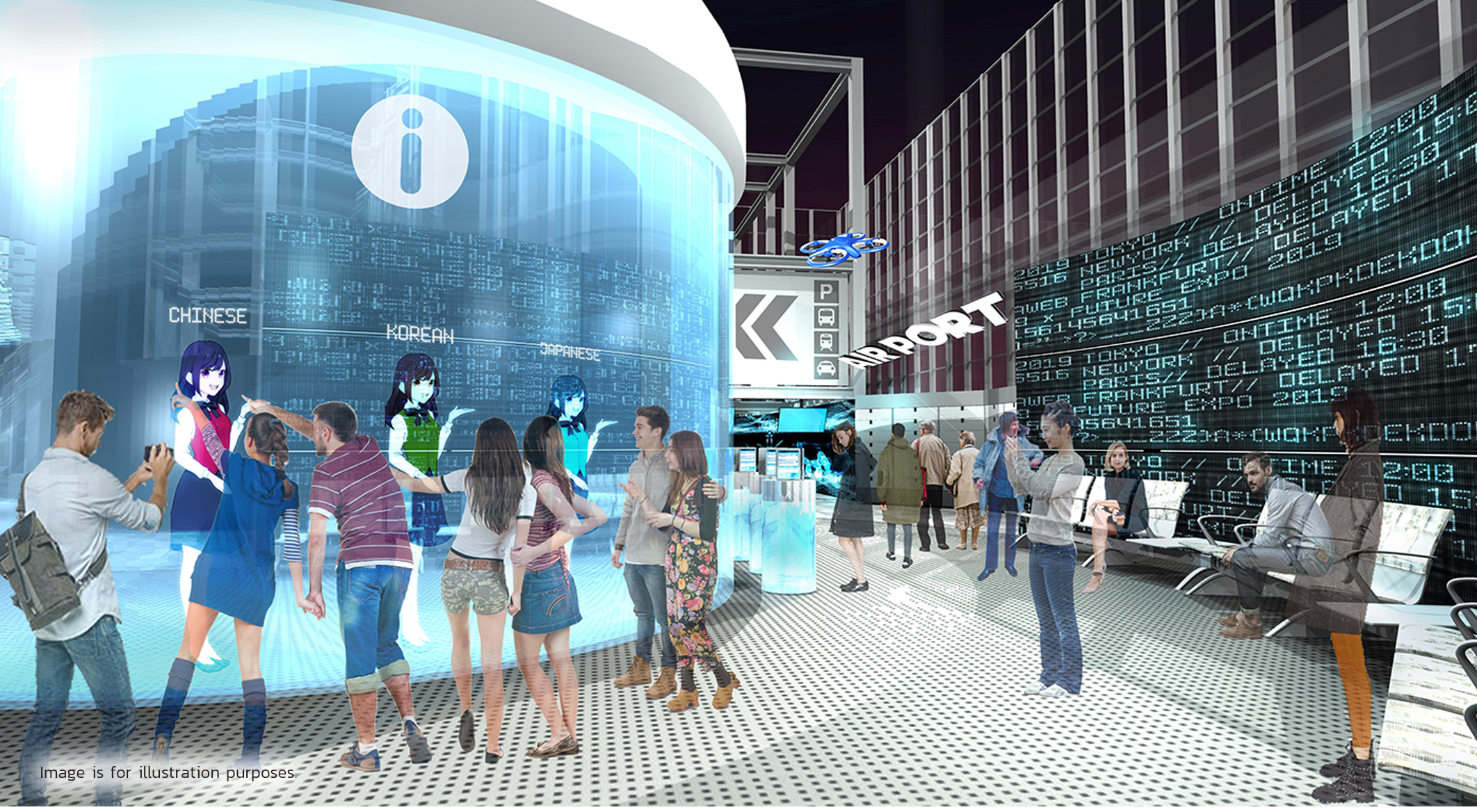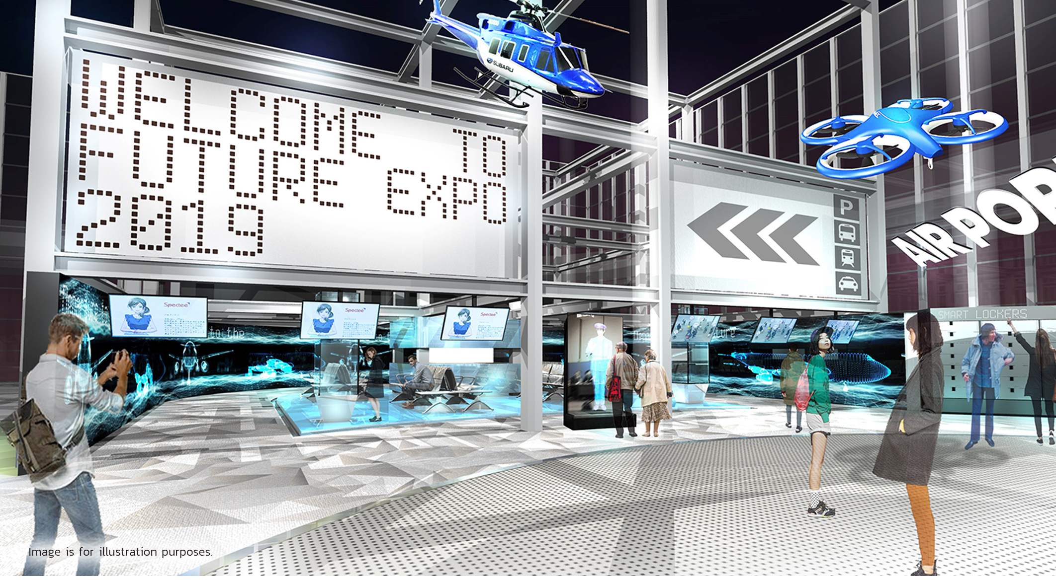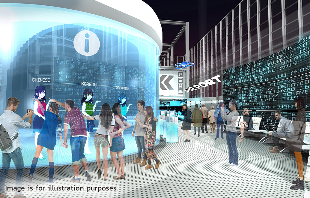 Virtual characters voiced by Japanese comedians greet visitors upon entering FUTURE EXPO. Visitors will be able to enjoy real-time conversation with these friendly guides while being assisted through the entrance area.