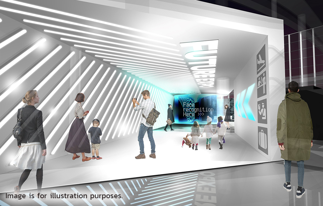 Visitors to the exhibit pass through a tunnel and enter the Japan of the future. As they emerge, they are met and guided through the entrance area by virtual characters voiced by Japanese comedians. With their entertaining conversation, these characters will immediately draw visitors deeper into the future. Venue staff will circulate in this area on new mobility vehicles while visitors start their journey through the exhibit’s futuristic space.