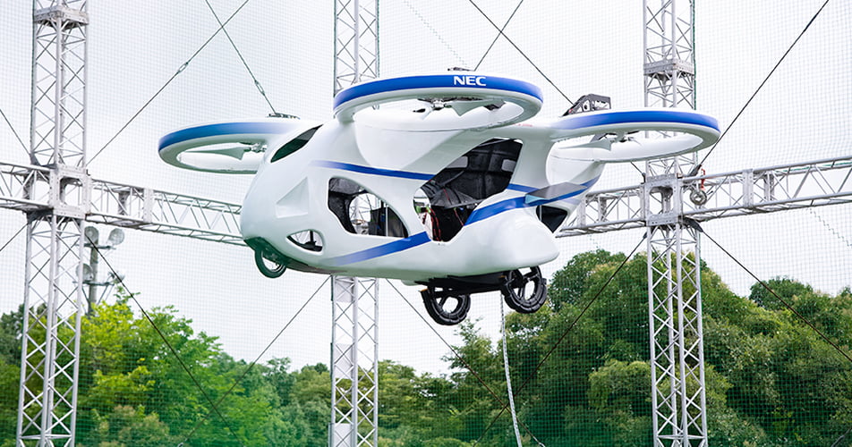 A result of NEC’s “fl ying car” development efforts, this future mobility vehicle will soon be straddling land and sky!