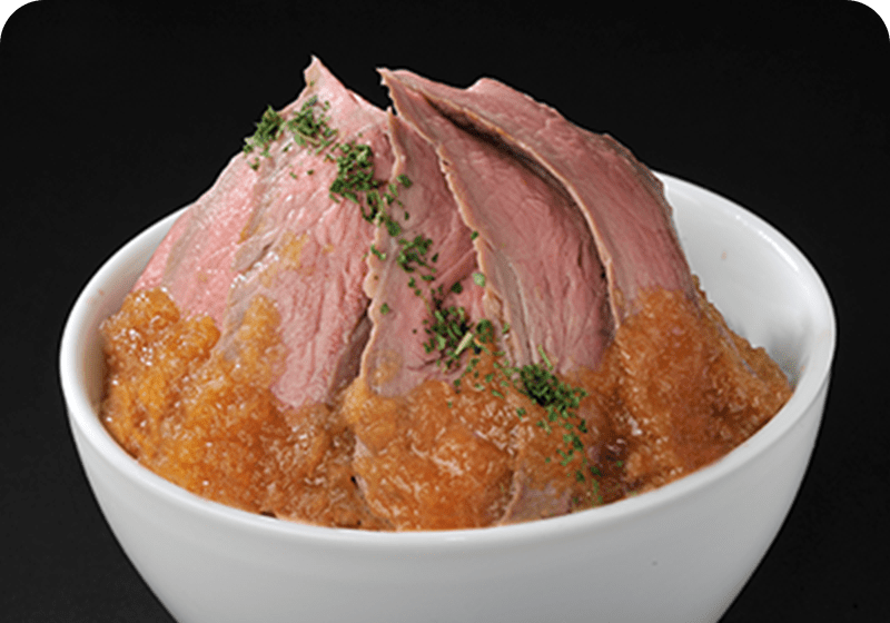 将泰庵名物『飲めるハンバーグ』。A5ランク黒毛和牛を使用した究極のハンバーグ。溢れ出る肉汁と今まで食べた事の無い新食感の味わいを是非ご堪能下さい。