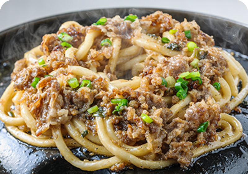 和牛カルビの薄スライスを、秘伝の醤油ベースのタレに漬け込んだ自慢の「プルコギ」。その肉汁で仕上げた焼うどんを特別価格で提供致します。肉の旨味をたっぷり吸った絶品焼うどんを是非、ご賞味ください。